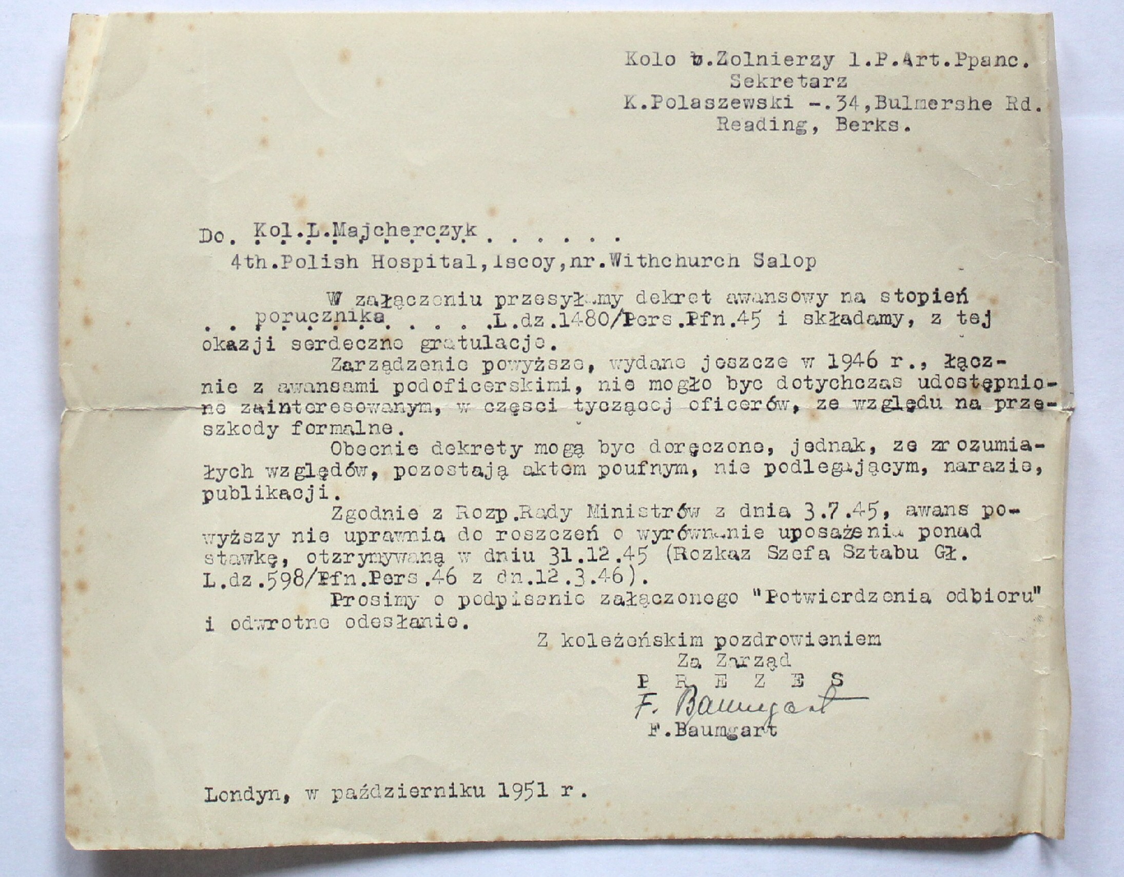 There are also a couple of documents in Polish (which I'm afraid I can't read, but I got my cousin to translate them for me). One is for another campaign medal, the Army Medal for War (Poland), which Wikipedia describes as being created by the Polish government-in-exile to reward Polish ground forces for service during WW2, with eligibility criteria including 6 months of operational service. The other is the amusing letter I mentioned earlier, written in 1951 but belatedly notifying my father of a promotion that was actually awarded several years previously. Here it is: