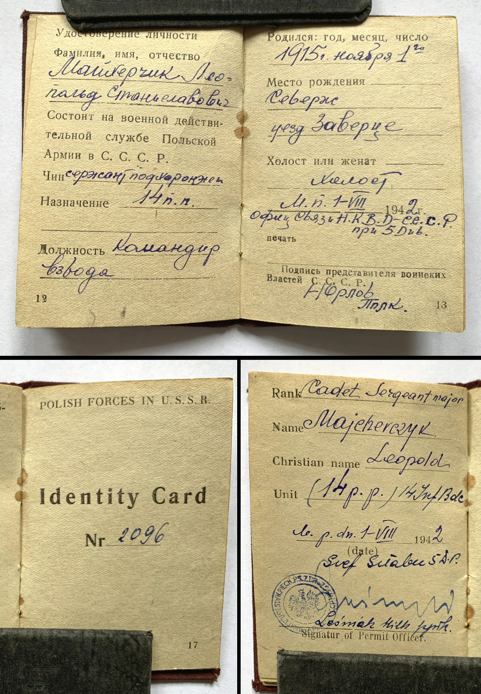 (2) After the German invasion in September 1939, he was interned in Russia for the duration of the Soviet/German non-aggression pact. I only know this from family anecdotes - the next datable documents are a couple of ID cards from 1941-42 where he is listed as a Cadet Sergeant Major in the "Polish Forces in the USSR". I think that's what Wikipedia describes under the heading of Anders' Army.