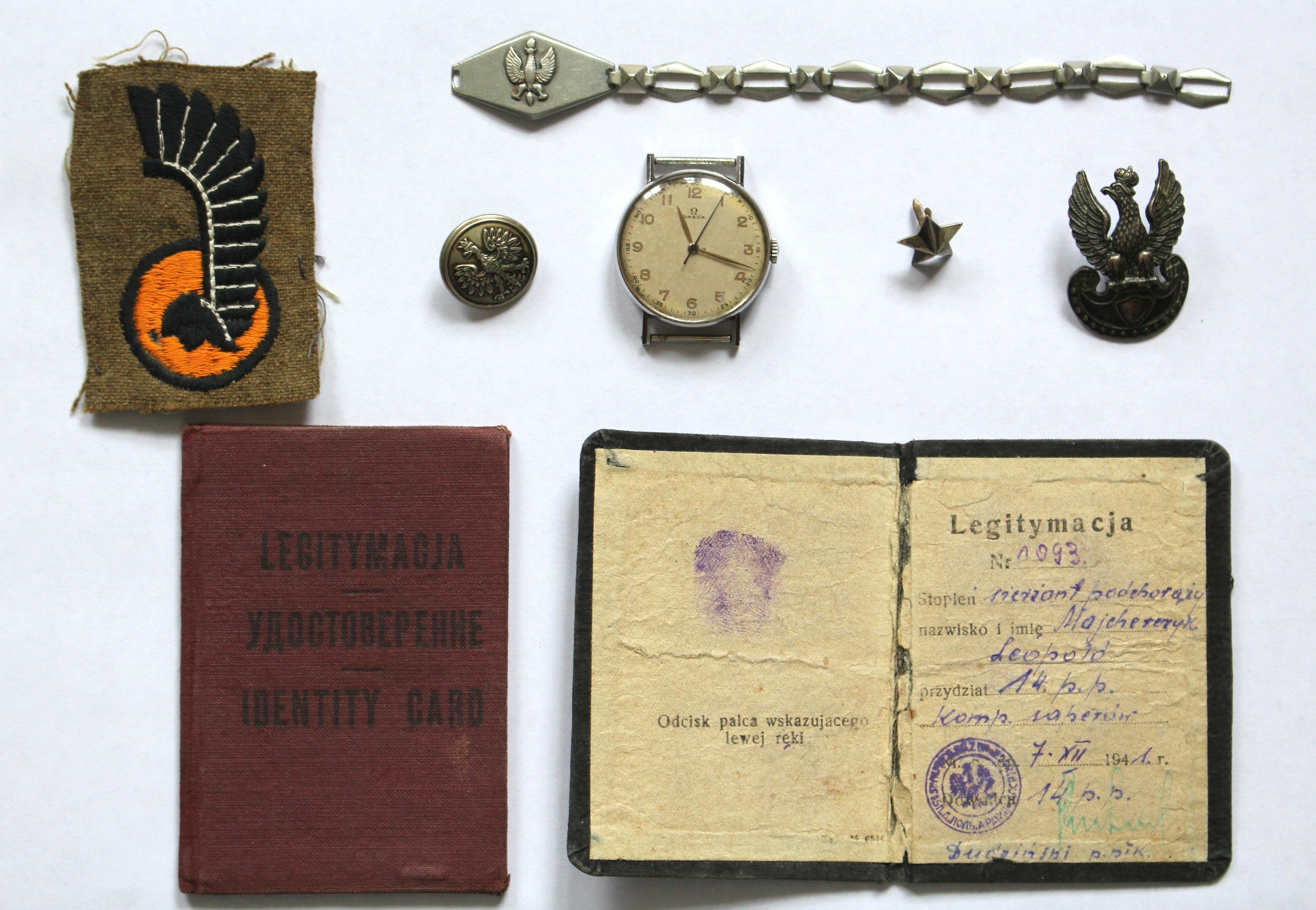 The patch at top left is from the Polish 1st Armoured Division (cf the emblem shown on this Wikipedia page). The items to the right of that include a button, cap badge and bracelet bearing the Polish eagle, and a 2nd Lieutenant's shoulder pip. I'm not certain that the watch is army issue, but its Omega brand and utilitarian styling suggest it probably is.