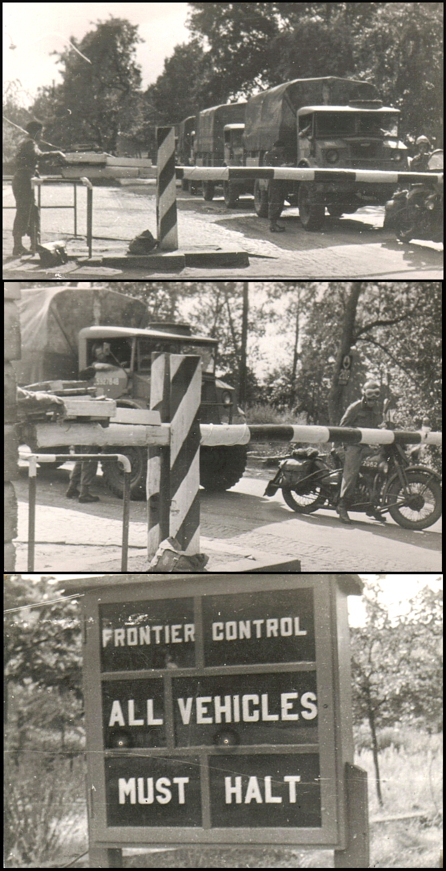 Here's a group of three pictures showing a border crossing of some kind. Presumably it's somewhere on the continent, between two different areas/countries controlled by the Allies, but I don't know specifically where.